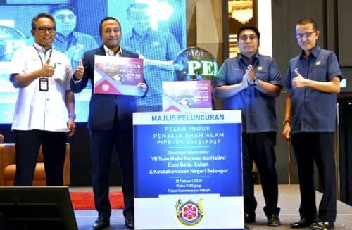 EXCO Keusahawanan Mohd Najwan Halimi (dua, kiri) menunjukkan buku Pelan Induk Peniaga Shah Alam (PIPE-SA) 2025-2030 dalam Majlis Penyerahan Permit dan Kit Bazar Ramadan Majlis Bandaraya Shah Alam (MBSA) di Pusat Konvensyen MBSA, Shah Alam pada 12 Februari 2025. Foto NUR FATIHAH/MEDIA SELANGOR