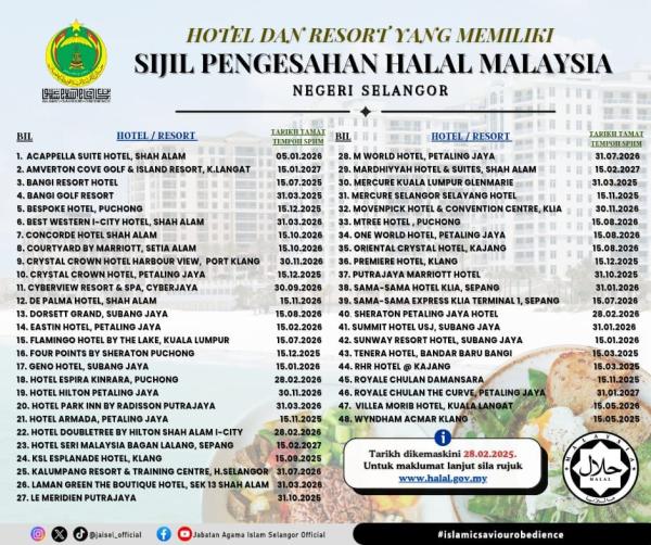 SHAH ALAM, 2 MAC: Sebanyak 48 hotel dan resort di Selangor memiliki sijil pengesahan halal Malaysia, menurut Jabatan Agama Islam Selangor (Jais).