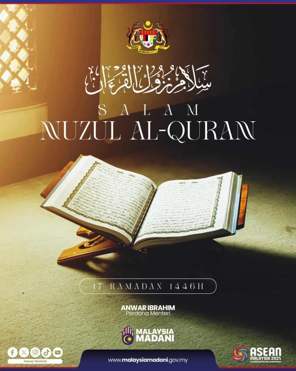 KUALA LUMPUR, 18 MAC: Perdana Menteri Datuk Seri Anwar Ibrahim mengucapkan salam Nuzul Quran kepada semua rakyat Malaysia walau di mana berada.