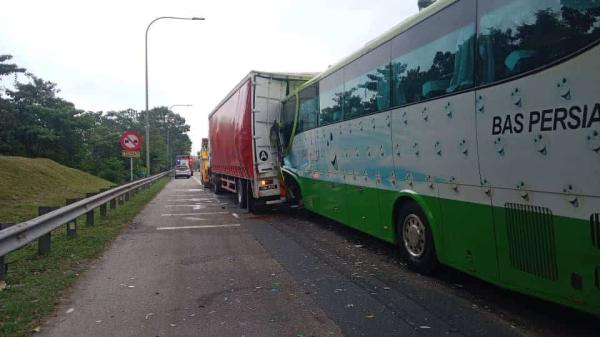 SEREMBAN, 22 MAC: Seorang pemandu bas ekspres cedera parah manakala 20 penumpang mengalami cedera ringan akibat kemalangan dengan sebuah lori treler di Kilometer 43 arah selatan Lebuh raya Elite pada 8 pagi tadi.