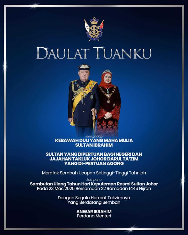 “Mengadap Kebawah Duli Yang Maha Mulia Sultan Ibrahim, Sultan Yang Dipertuan Bagi Negeri dan Jajahan Takluk Johor Darul Ta’zim, Yang di-Pertuan Agong. Merafak sembah ucapan setinggi-tinggi tahniah sempena Sambutan Ulang Tahun Hari Keputeraan Rasmi pada 23 Mac 2025.