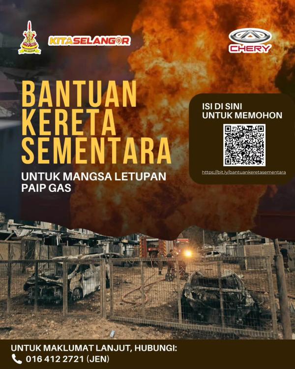 KUALA LUMPUR, 2 APRIL: Syarikat automotif Chery Malaysia menyediakan sebanyak 50 kereta untuk kegunaan mangsa insiden kebakaran saluran paip gas di Putra Heights selama sebulan, kata Exco Pelaburan, Perdagangan dan Mobiliti Negeri Selangor Ng Sze Han.