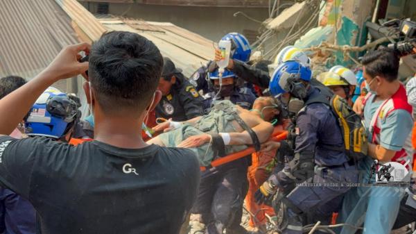 Pasukan Mencari dan Menyelamat Khas Malaysia (SMART) berusaha mengesan mangsa yang terperangkap di bawah runtuhan bangunan susulan gempa bumi kuat di Myanmar pada 31 Mac 2025. Foto Facebook Pasukan Mencari dan Menyelamat Khas Malaysia[/caption]