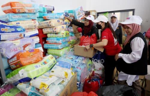 Sukarelawan Wanita Berdaya Selangor (WBS) menyusun barang keperluan untuk diagihkan kepada mangsa kebakaran paip gas di Pusat Perpindahan Sementara (PPS) Dewan Serbaguna di Masjid Putra Height, Subang Jaya pada 4 April 2025. Foto AHMAD ZAKKI JILAN/MEDIA SELANGOR