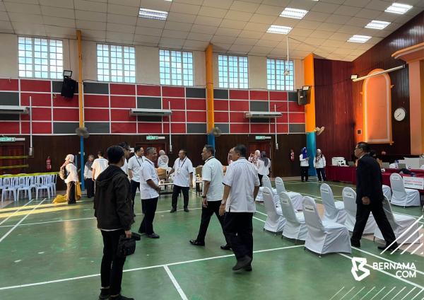 TAPAH, 12 APRIL: Pusat penamaan calon bagi Pilihan Raya Kecil (PRK) Dewan Undangan Negeri (DUN) Ayer Kuning di Dewan Merdeka di sini dibuka, 9 pagi ini.