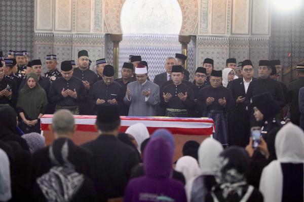 “Penghormatan negara (istiadat Pengebumian Negara) yang diberikan hari ini sebagai tanda penghargaan atas segala sumbangannya dan jerih perih beliau dalam politik sepanjang pentadbirannya,” katanya selepas memberi penghormatan terakhir kepada Allahyarham di Dewan Solat Utama Masjid Negara hari ini.