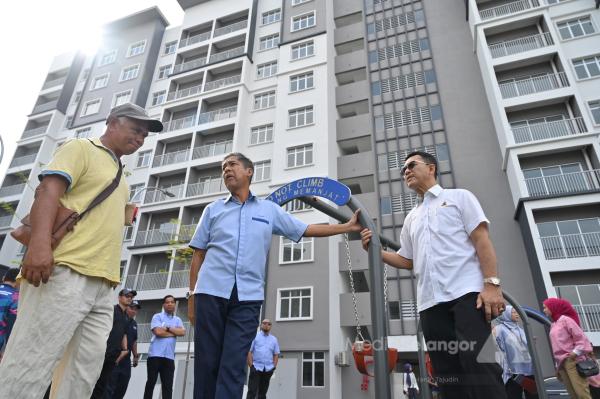 EXCO Perumahan Datuk Borhan Aman Shah bersama Abu Samah Rahmat, 58, meninjau Pangsapuri Seri Suria, Kota Warisan, Sepang Selangor pada 16 April 2025. Foto HARUN TAJUDIN/MEDIA SELANGOR[/caption]