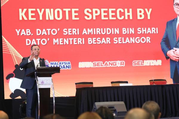 Dato’ Menteri Besar Dato’ Seri Amirudin Shari (tengah) selepas Majlis Menandatangani Usahasama antara Nestle Malaysia dan KDEB Waste Management (KDEBWM) di Pusat Konvensyen Shah Alam pada 22 April 2025. Foto NUR ADIBAH AHMAD IZAM/MEDIASELANGOR[/caption]