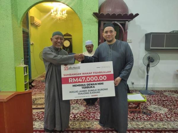 Agensi itu memaklumkan, sumbangan RM47,000 diserahkan kepada Masjid Jamek Sungai Burong, Tanjung Karang pada 10 Mei bagi membina dewan mini terbuka di masjid berkenaan.