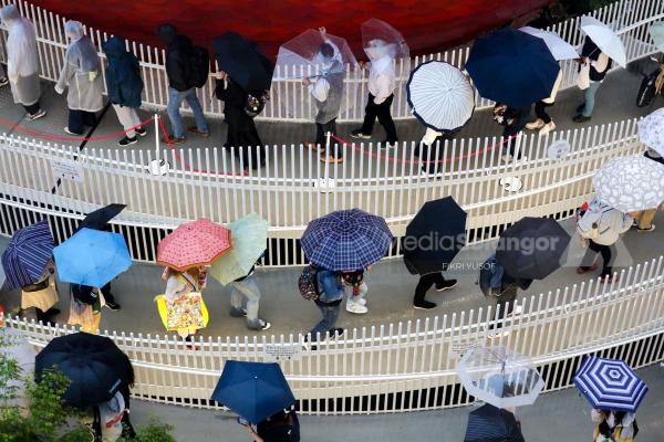 Pengunjung beratur dan berpayung dalam keadaan hujan untuk memasuki pameran di pavilion ketika tinjauan sekitar Ekspo Dunia Osaka 2025, Jepun pada 8 Mei 2025. Foto FIKRI YUSOF/MEDIA SELANGOR