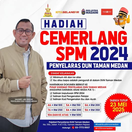 SHAH ALAM, 15 MEI: Pelajar cemerlang Sijil Pelajaran Malaysia (SPM) 2024 di Dewan Undangan Negeri (DUN) Taman Medan berpeluang menerima insentif tunai sehingga RM500 menerusi program Hadiah Pelajar Cemerlang.