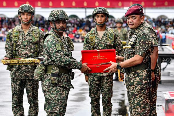 Anugerah berkenaan disampaikan Panglima Tentera Darat Tan Sri Muhammad Hafizuddeain Jantan kepada Staf Sarjan Muhammad Nizam Samsul Anuar, 37, dari Pusat Latihan Kor Perkhidmatan Diraja Kem Volturno Perak dan Anggota Tentera Cawangan Khas Sabah dari Unit 92 Sarjan Severinus Sapitin, 30, pada Majlis Perbarisan Tamat Latihan Perajurit Muda Lelaki Siri 202/2024 di sini hari ini.