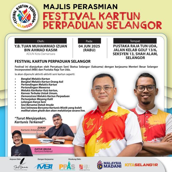 SHAH ALAM, 29 MEI: Lebih 300 peserta pelbagai kaum dan peringkat usia bakal memeriahkan Festival Kartun Perpaduan Selangor yang dijadual berlangsung di Pustaka Raja Tun Uda, di sini pada 4 Jun ini.