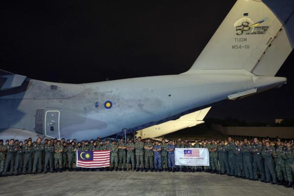 Dua pesawat A400M milik Tentera Udara Diraja Malaysia (TUDM) yang membawa 69 pegawai dan anggota daripada pelbagai kepakaran antaranya Forward Anaesthesia and Surgical Team (FAST), elemen dari Rejimen Askar Jurutera Diraja (RAJD) serta pasukan keselamatan tiba di Lapangan Terbang Pangkalan Udara Subang pada 8.30 malam tadi.