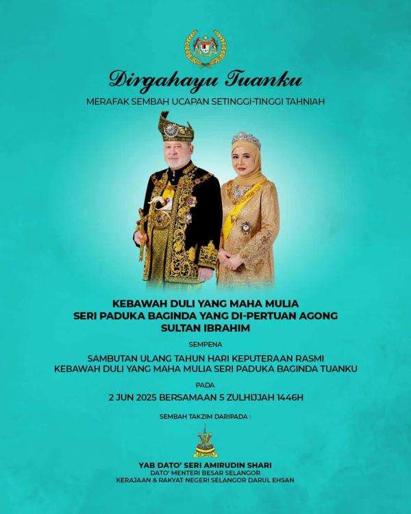 SHAH ALAM, 2 JUN: Dato’ Menteri Besar merafak sembah menzahirkan ucapan tahniah sempena Ulang Tahun Hari Keputeraan Rasmi Yang di-Pertuan Agong Sultan Ibrahim.