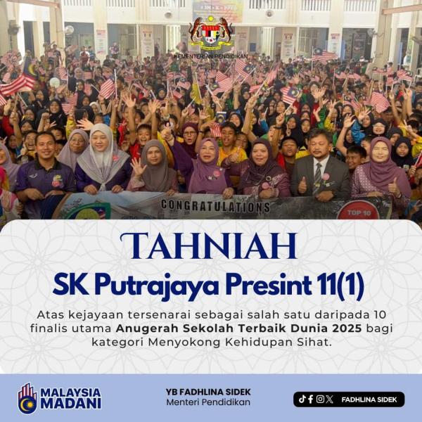 LANGKAWI, 19 JUN: Pencapaian Sekolah Kebangsaan (SK) Putrajaya Presint 11 (1) sebagai finalis Anugerah Sekolah Terbaik Dunia 2025 bagi kategori Menyokong Kehidupan Sihat membuktikan sekolah di Malaysia mampu menyerlah di persada antarabangsa.