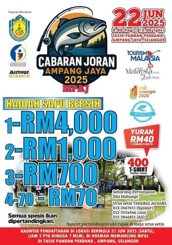 “Semua spesies ikan dipertandingkan kali ini. Yuran RM40 dikenakan untuk sebatang joran dan 400 penyertaan awal akan turut menerima T-shirt percuma,” katanya menerusi kenyataan.