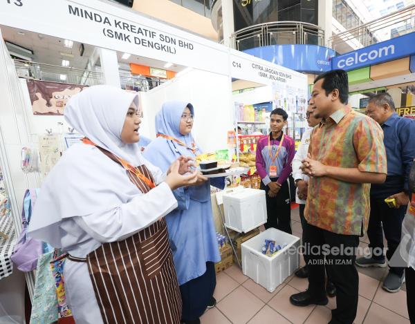 Pelajar Sekolah Menengah Kebangsaan Seksyen 9 Shah Alam menunjukkan produk yang dijual mereka pada majlis Perasmian Karnival Usahawan PKNS (KUP) 2025 di Kompleks PKNS Shah Alam pada 12 Julai 2025. Foto NUR ADIBAH AHMAD IZAM/MEDIASELANGOR[/caption]