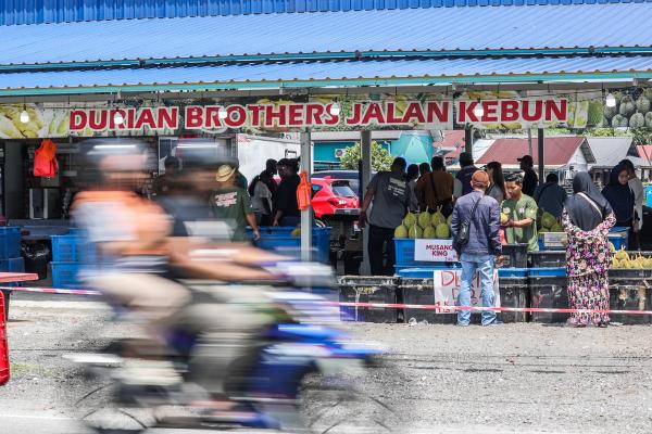 KLANG, 14 JUL: Suasana di sekitar Jalan Kebun di sini kini bagaikan pesta durian apabila deretan gerai menjual ‘raja buah’ itu membanjiri kawasan berkenaan, menarik perhatian penggemar tegar durian.