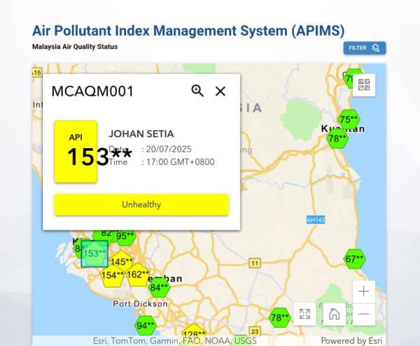 Sejak semalam, Banting dan Johan Setia mencatat bacaan IPU tidak sihat. Setakat 1.47 petang tadi, kedua-dua kawasan merekodkan bacaan 154.