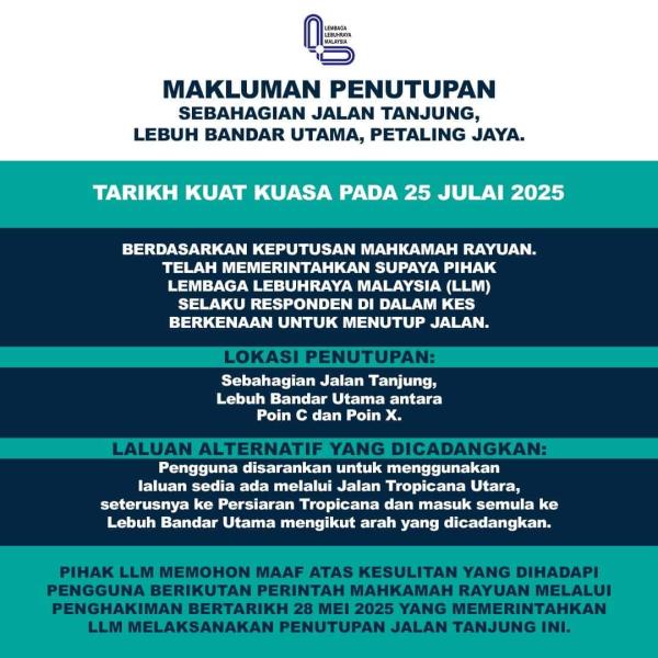 SHAH ALAM, 24 JULAI: Sebahagian Jalan Tanjung di Lebuh Bandar Utama, Petaling Jaya akan ditutup kepada semua lalu lintas mulai esok susulan arahan Mahkamah Rayuan terhadap Lembaga Lebuhraya Malaysia (LLM).