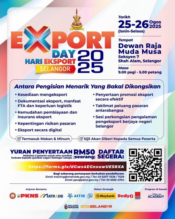 SHAH ALAM, 18 OGOS: Usahawan tempatan berpeluang mempelajari selok-belok eksport produk ke pasaran antarabangsa menerusi penganjuran Hari Eksport Selangor 2025 pada 25 dan 26 Ogos ini.