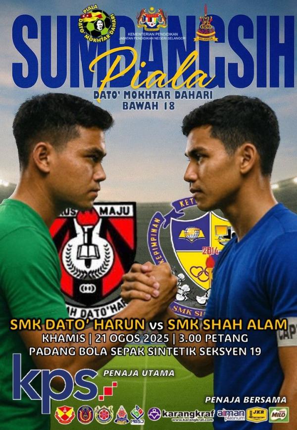 SHAH ALAM, 21 OGOS: Pasukan pilihan Sekolah Menengah Kebangsaan (SMK) Shah Alam menepati ramalan apabila muncul juara Piala Sumbangsih Piala Datuk Mokhtar Dahari Bawah 18 tahun (B-18) selepas menumpaskan SMK Datuk Harun 5-1 hari ini.