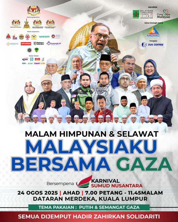 KUALA LUMPUR, 23 OGOS: Perdana Menteri Datuk Seri Anwar Ibrahim mengajak rakyat Malaysia untuk bersama-sama menghadiri Himpunan dan Selawat Malaysiaku Bersama Gaza di Dataran Merdeka pada esok sebagai tanda solidariti terhadap perjuangan rakyat Palestin.