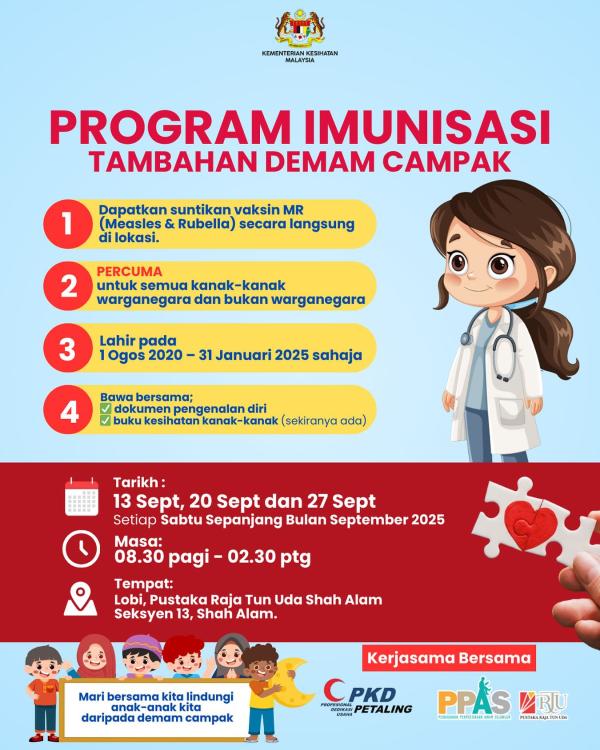 SHAH ALAM, 13 SEPT: Kementerian Kesihatan Malaysia (KKM) dengan kerjasama Perbadanan Perpustakaan Awam Selangor (PPAS) mengadakan Program Imunisasi Tambahan Demam Campak secara percuma pada 13, 20 dan 27 September ini di lobi Pustaka Raja Uda.