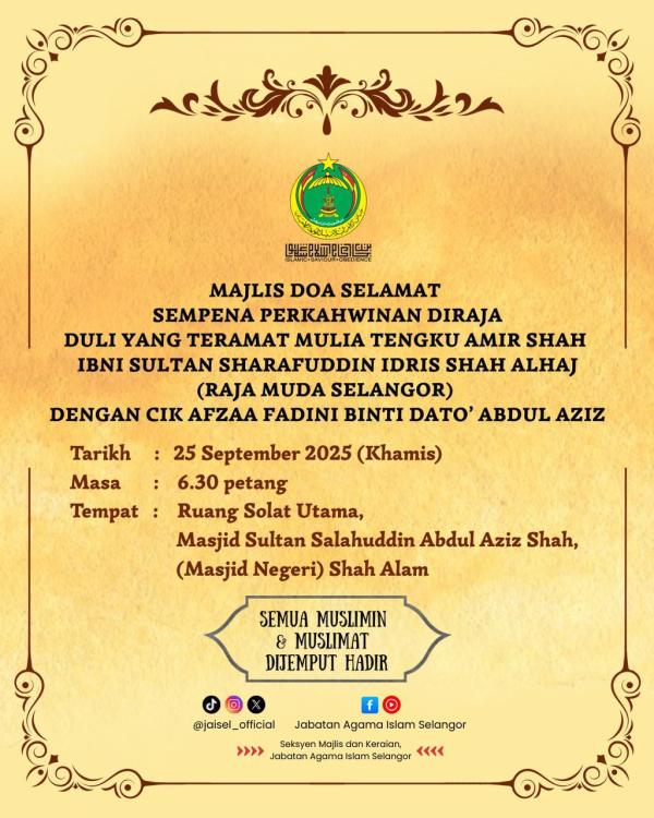 SHAH ALAM, 22 SEPT: Orang awam serta penjawat awam di Selangor dijemput menghadiri majlis doa selamat sempena perkahwinan Diraja Duli Yang Teramat Mulia Raja Muda Selangor Tengku Amir Shah dengan Cik Afzaa Fadini Dato’ Abdul Aziz.