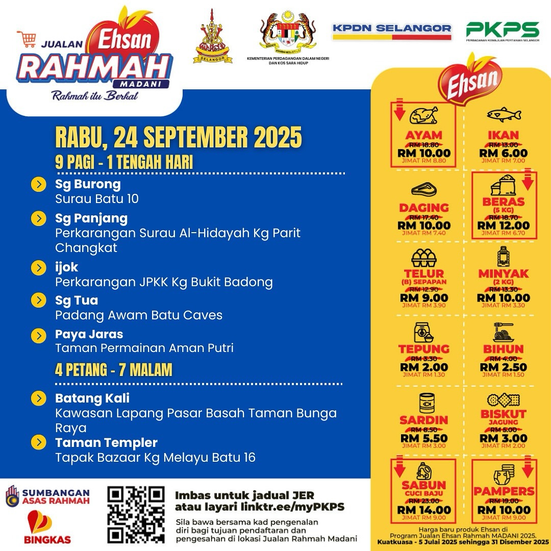 SHAH ALAM, 24 SEPT: Program Jualan Ehsan Rahmah (JER) kendalian Perbadanan Kemajuan Pertanian Selangor (PKPS) dan Kementerian Perdagangan Dalam Negeri dan Kos Sara Hidup (KPDN) diteruskan ke tujuh lokasi, hari ini.