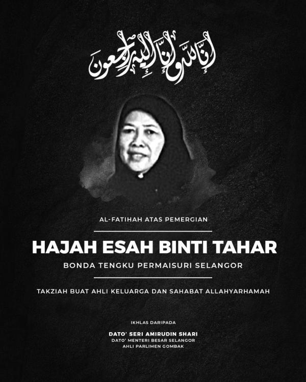 SHAH ALAM, 28 SEPT: Dato’ Menteri Besar menzahirkan sembah takziah kepada Duli Yang Maha Mulia (DYMM) Sultan Selangor dan DYMM Tengku Permaisuri Selangor atas pemergian bonda Tengku Permaisuri Hajah Norashikin pagi tadi.