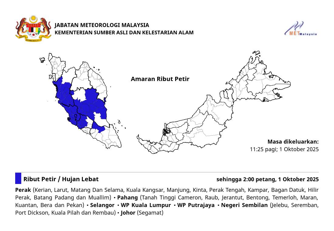 Cuaca sama diramal berlaku di Kuala Lumpur dan Putrajaya selain beberapa daerah di Perak, Pahang, Negeri Sembilan dan Johor.