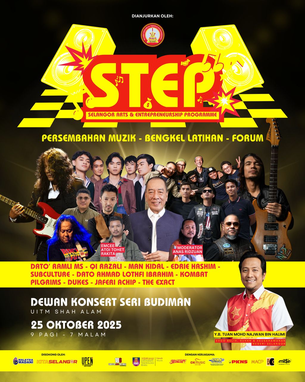 Najwan menambah, STEP2025 akan diserikan dengan barisan artis tanah air termasuk legenda gitaris Man Kidal, maestro muzik Dato’ Ramli MS, Edrie Hashim, Qi Razali, kumpulan Kombat Pilgrims dan Dukes.