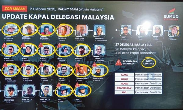 Kenyataan Pusat Gerakan Operasi Sumud Nusantara (SNCC) memaklumkan bahawa setakat 3.30 petang ini, sebanyak 15 sukarelawan kemanusiaan GSF rakyat Malaysia disahkan telah ditahan tentera Israel selepas kapal dinaiki mereka dipintas ketika memasuki zon merah.