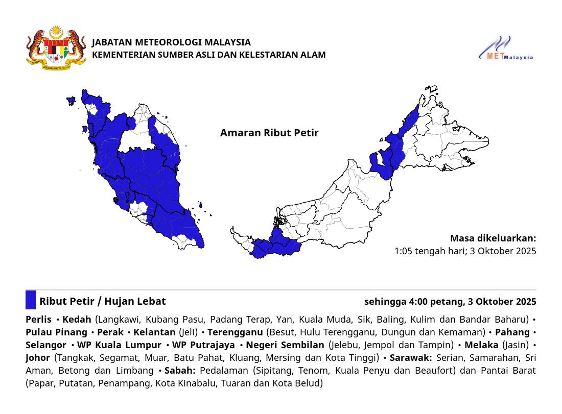 SHAH ALAM, 3 OKT: Jabatan Meteorologi Malaysia (MetMalaysia) meramalkan ribut petir dan hujan lebat melanda seluruh Selangor, Kuala Lumpur dan Putrajaya hingga 4 petang ini.