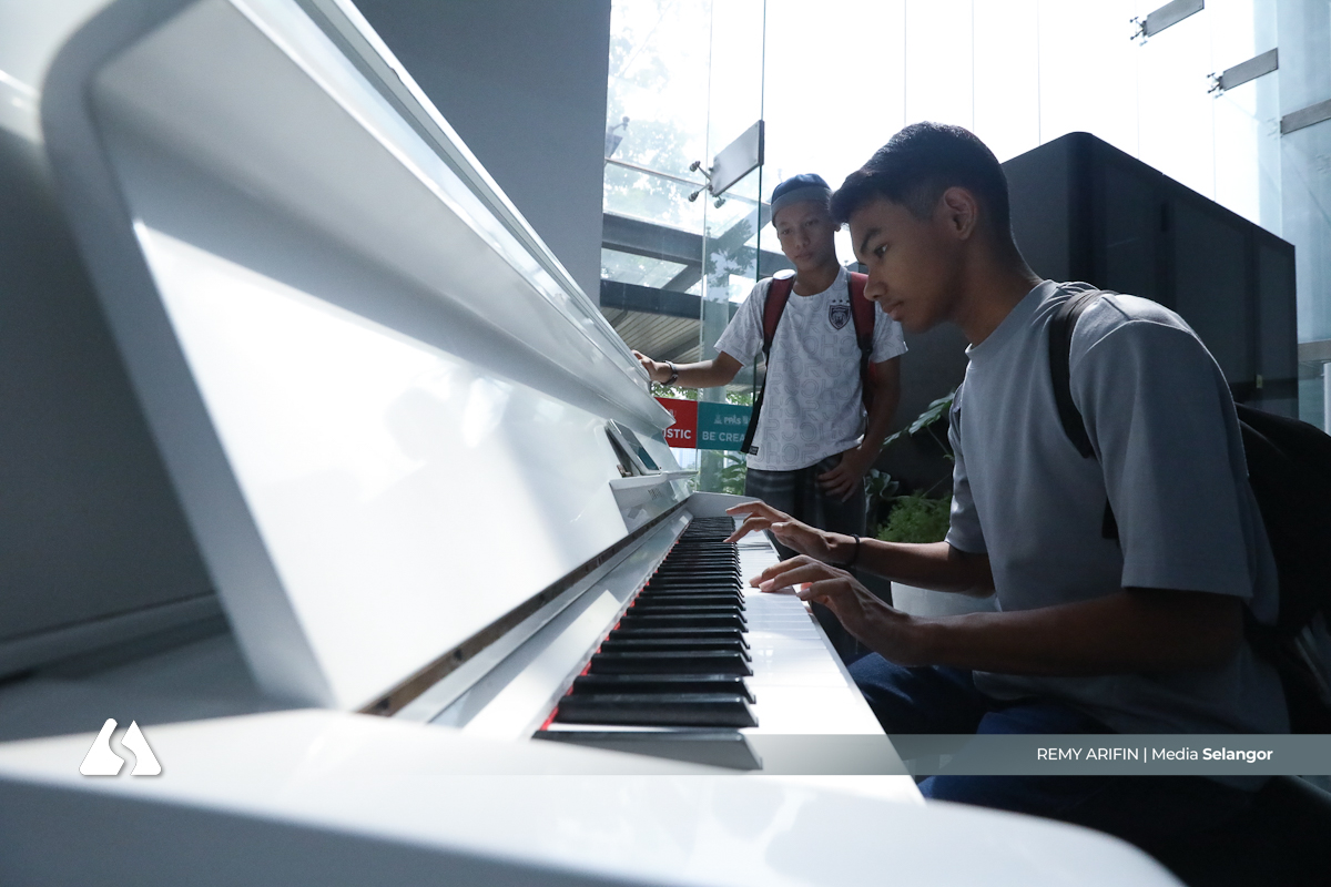 Mohd Umar, 15, memainkan piano yang disediakan di Perpustakaan Raja Tun Uda sambil ditemani rakannya sebelum pulang