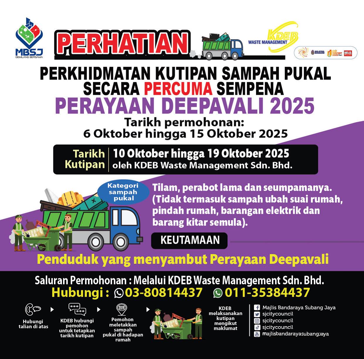 SHAH ALAM, 5 OKT: Majlis Bandaraya Subang Jaya (MBSJ) menawarkan perkhidmatan kutipan sampah pukal secara percuma sempena perayaan Deepavali.