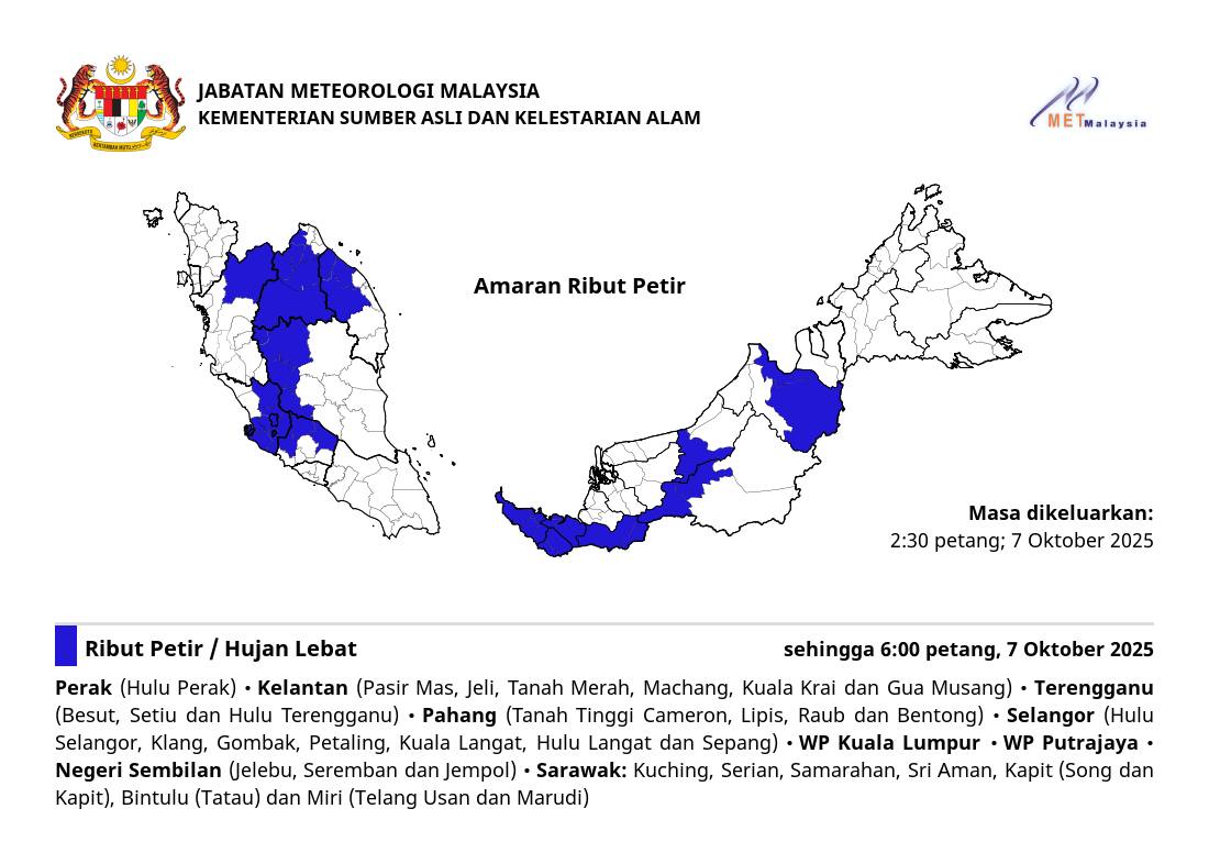 Amaran sama dikeluarkan di Kuala Lumpur, Putrajaya selain beberapa tempat di Perak, Kelantan, Terengganu, Pahang, Negeri Sembilan dan Sarawak.