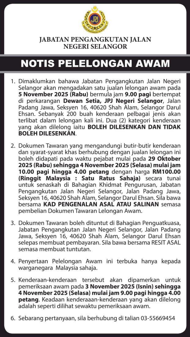 JPJ Selangor memaklumkan penyertaan lelongan ini terbuka kepada warganegara Malaysia sahaja, manakala sebarang pertanyaan boleh dibuat melalui talian 03-55669454.