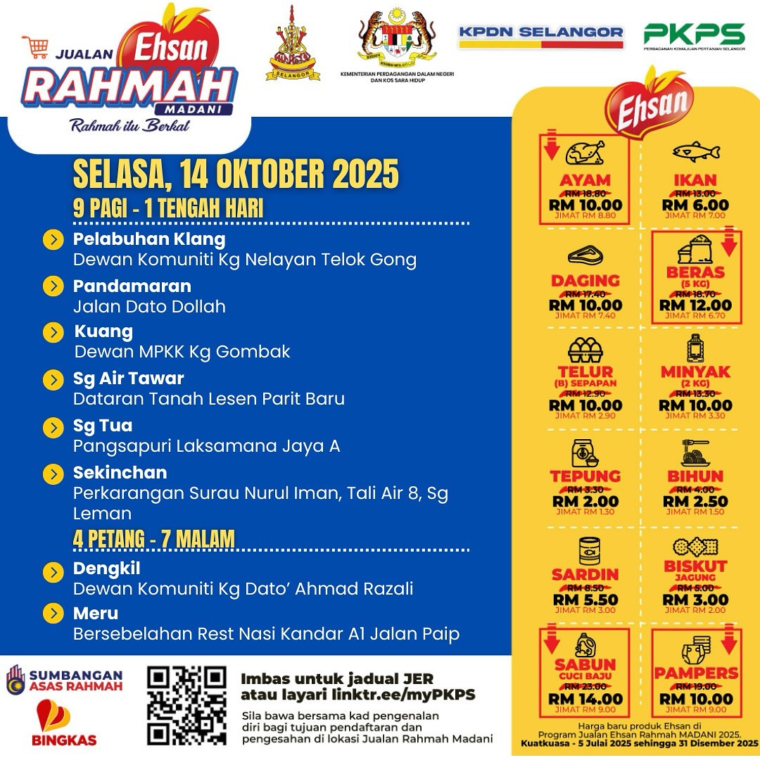 SHAH ALAM, 14 OKT: Program Jualan Ehsan Rahmah (JER) kendalian Perbadanan Kemajuan Pertanian Selangor (PKPS) dan Kementerian Perdagangan Dalam Negeri dan Kos Sara Hidup (KPDN) diteruskan ke lapan lokasi, hari ini.