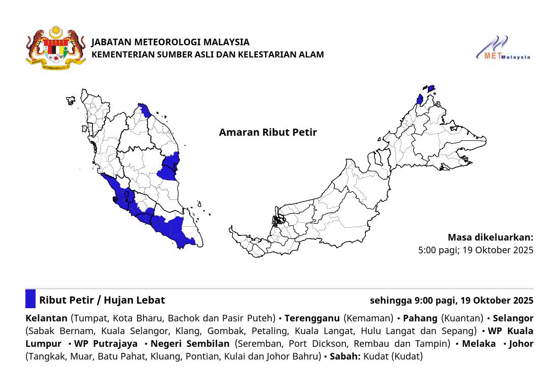 SHAH ALAM, 11 OKT: Jabatan Meteorologi Malaysia (MetMalaysia) meramalkan hujan lebat dan ribut petir melanda hampir semua derah di Selangor iaitu Sabak Bernam, Kuala Selangor, Klang, Gombak, Petaling, Kuala Langat, Hulu Langat dan Sepang hingga 9 pagi ini.
