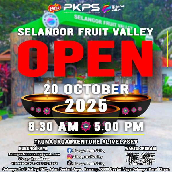 SHAH ALAM, 19 OKT: Selangor Fruit Valley (SFV) akan dibuka kepada orang ramai cuti umum sempena cuti Deepavali esok dengan menawarkan pelbagai aktiviti menarik buat seisi keluarga.