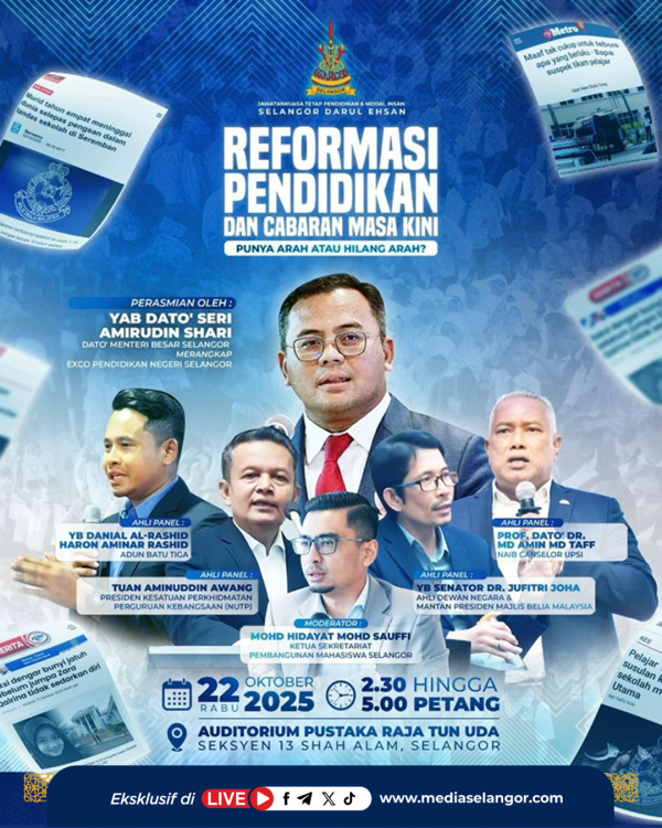 SHAH ALAM, 22 OKT: Orang ramai berpeluang mengikuti forum Reformasi Pendidikan dan Cabaran Masa Kini: Punya Arah Atau Hilang Arah? secara eksklusif di www.mediaselangor.com hari ini.