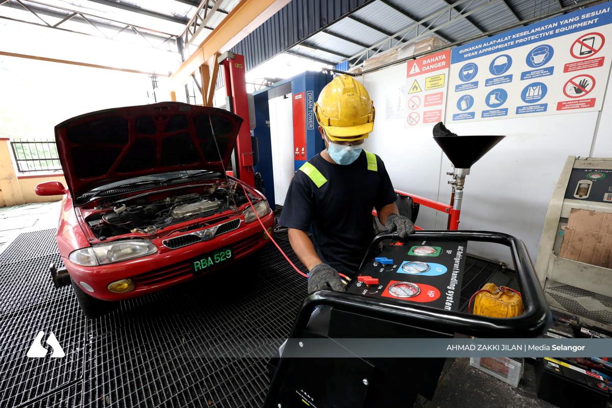 Pekerja membuang semua cecair berbahaya daripada kenderaan yang akan dilupuskan bagi mengelakkan pencemaran alam sekitar.