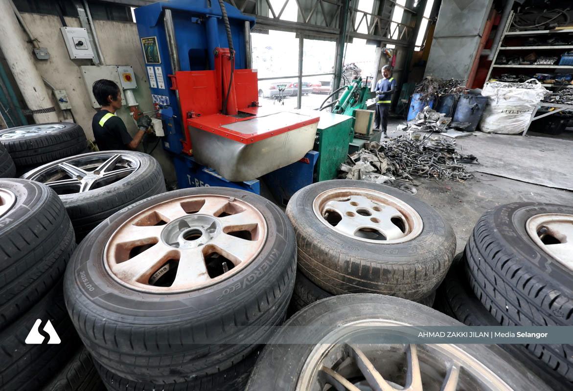 Dalam proses pelupusan kenderaan tamat hayat (ELV), pekerja memisahkan tayar daripada rim menggunakan peralatan khas bagi memastikan setiap komponen dapat dikitar semula dengan betul.