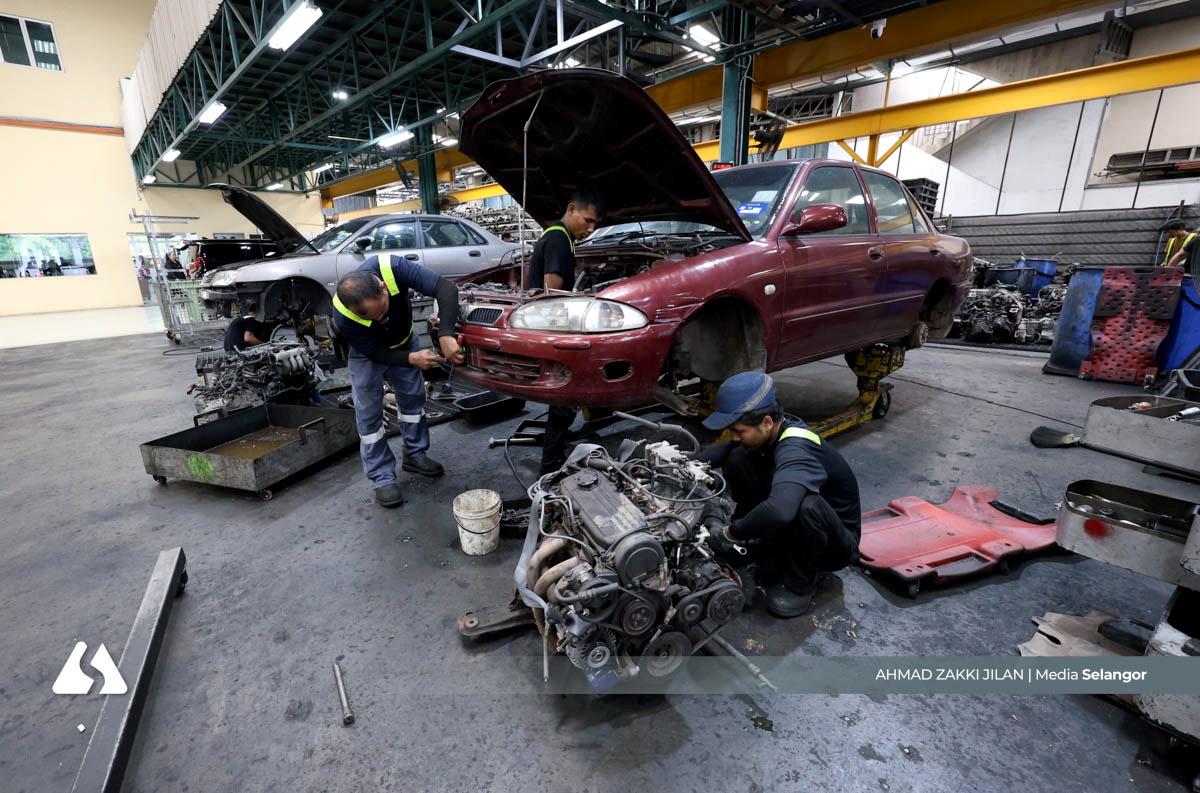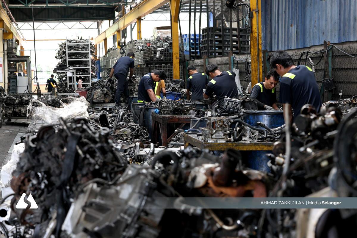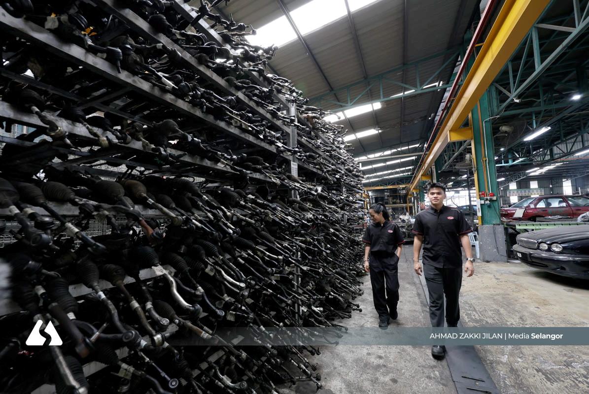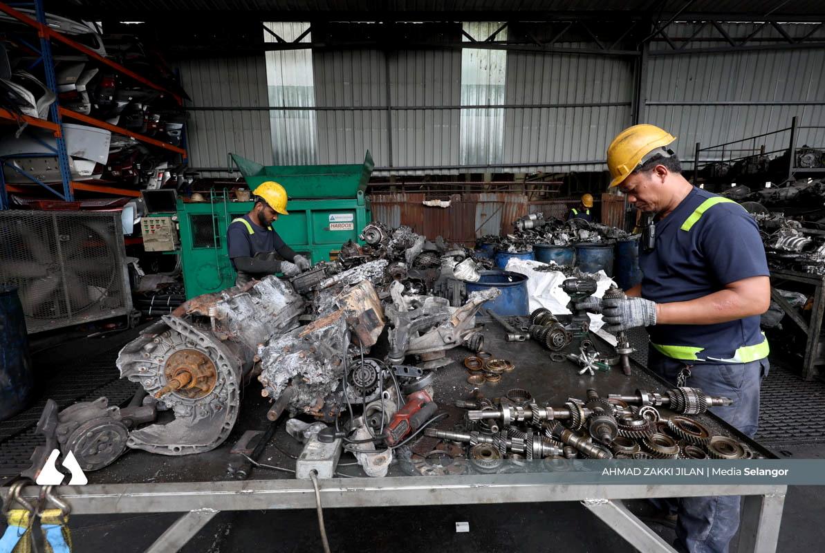 Pekerja mengasingkan pelbagai komponen kenderaan yang boleh digunakan semula di pusat pelupusan Car Medic Sdn Bhd, Bandar Teknologi Kajang