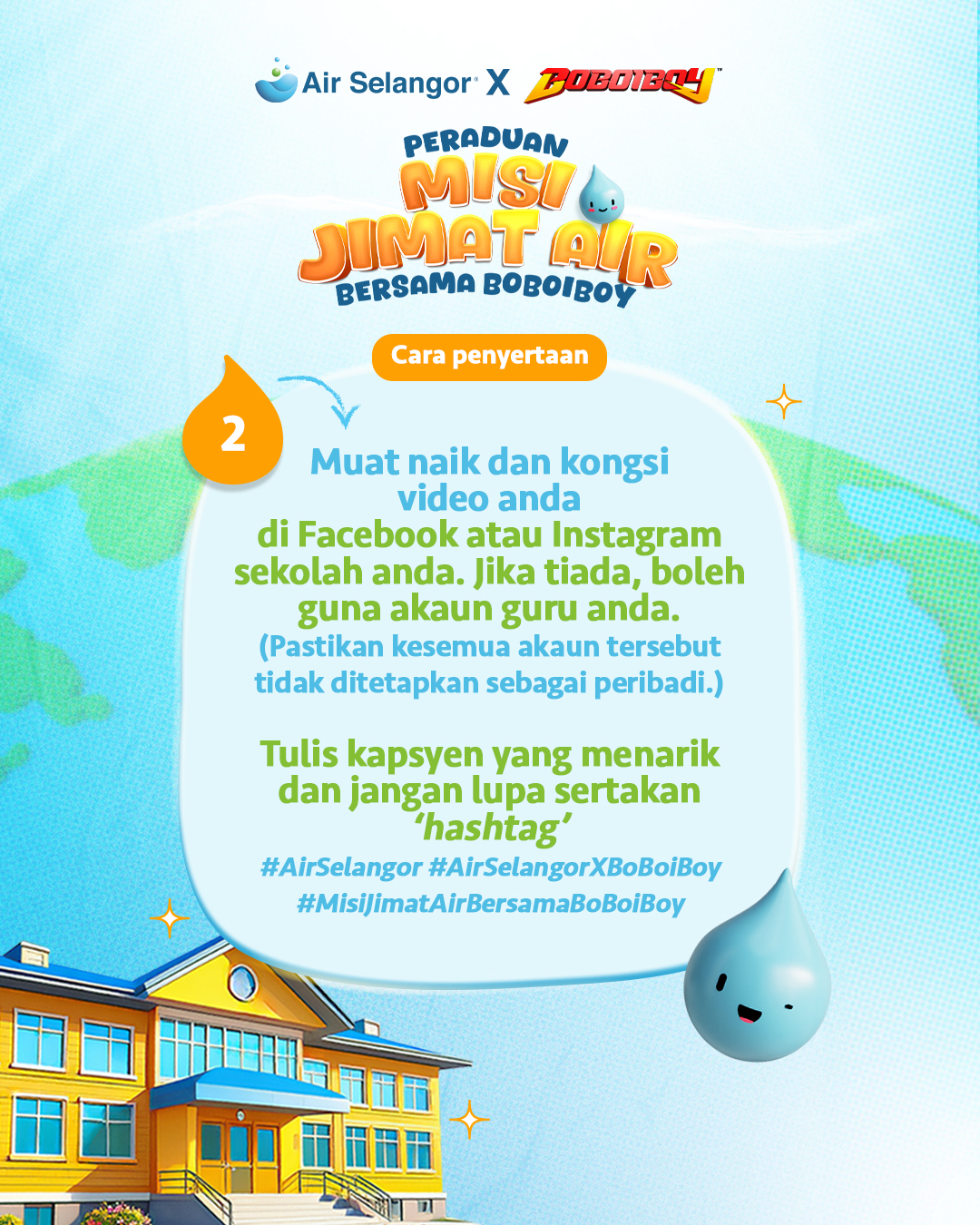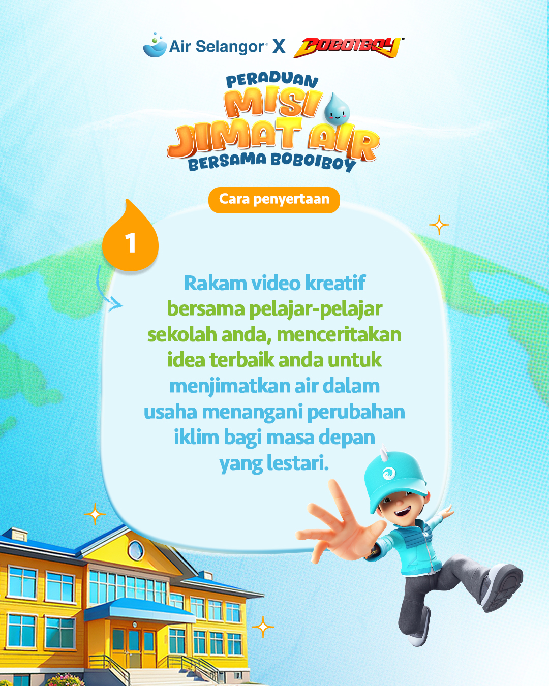 Peserta hanya perlu memuat naik video penyertaan di platform media sosial Facebook atau Instagram menggunakan akaun rasmi sekolah atau guru, disertakan kapsyen menarik dan tanda pagar #AirSelangor #AirSelangorXBoBoiBoy #MisiJimatAirBersamaBoBoiBoy