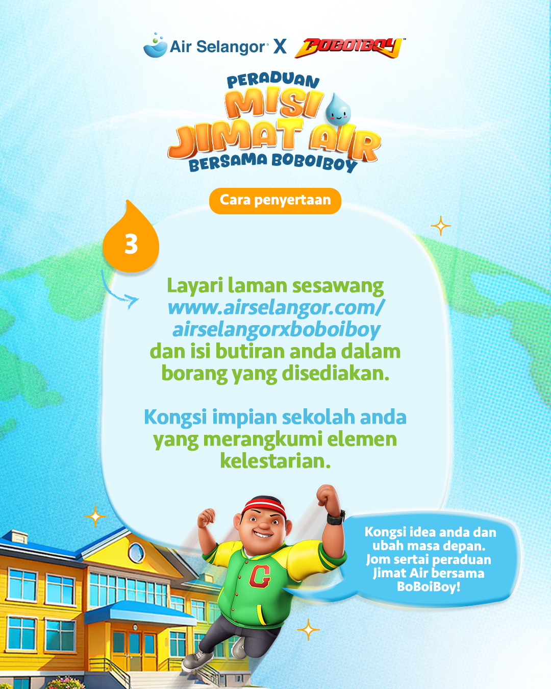 Peserta juga perlu mengisi maklumat penyertaan melalui borang atas talian di laman rasmi Air Selangor. Untuk maklumat lanjut, layari www.airselangor.com/airselangorxboboiboy.