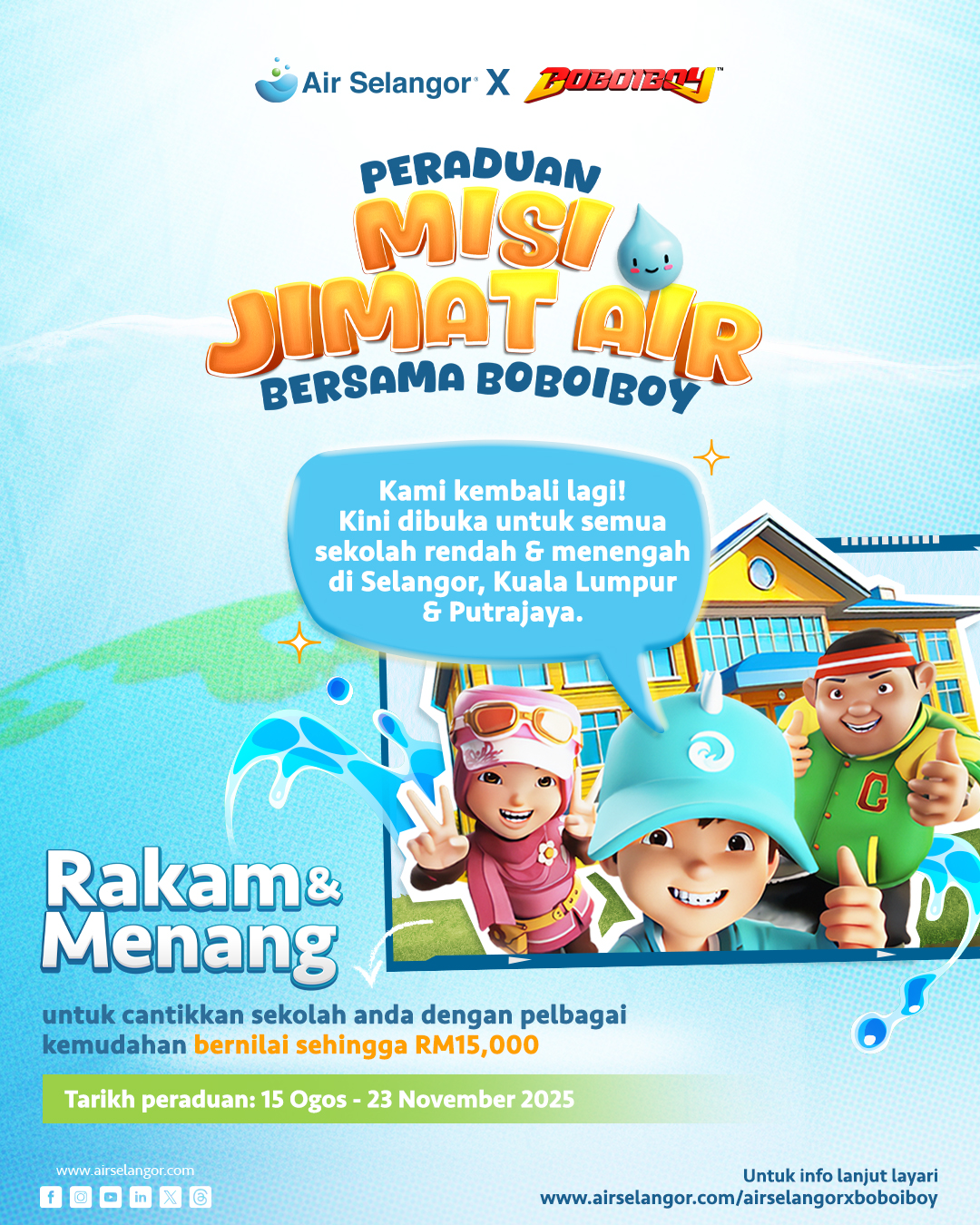 SHAH ALAM, 24 OKT: Pengurusan Air Selangor Sdn Bhd (Air Selangor) terus komited mendidik generasi muda mengenai kepentingan penjimatan air menerusi Peraduan Misi Jimat Air Bersama BoBoiBoy 2025, yang kini memasuki tahun kedua penganjurannya.